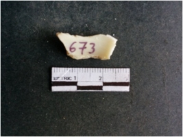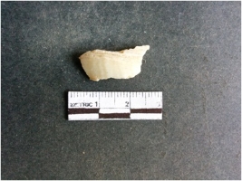 | Description / विवरण | The shell fragment is a small piece, with truncated ends and sharp edges. The piece has natural polish on its inner surface and outer surface has natural rough striations. The piece is pale white in color. The piece is waste material bi - product as a result of shell working at the site. |