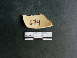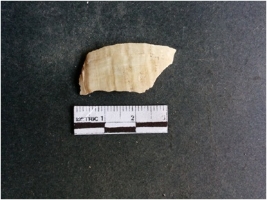 | Description / विवरण | The shell fragment is a small piece, with truncated ends and sharp edges. The piece has natural polish on its inner surface and outer surface has natural rough striations. The piece is pale white in color. The piece is waste material bi - product as a result of shell working at the site. |