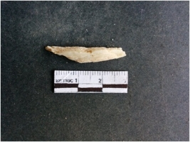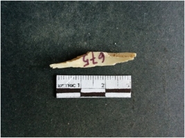 | Description / विवरण | The shell fragment is a small piece, with truncated ends and sharp edges. The piece has natural polish on its inner surface and outer surface has natural rough striations. The piece is pale white in color. The piece is waste material bi - product as a result of shell working at the site. |