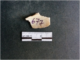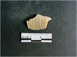 | Description / विवरण | The shell fragment is a small piece, with truncated ends and sharp edges. The piece has natural polish on its inner surface and outer surface has natural rough striations. The piece is pale white in color. The piece is waste material bi - product as a result of shell working at the site. |