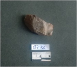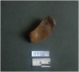 | Description / विवरण | This is a chert stone fragment with one side covered with cortex, positive bulb of percussion and sharp flaked ridges. Smooth surface and brown in color. |