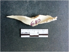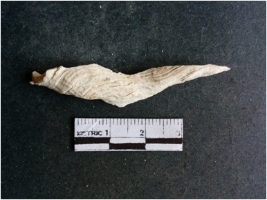 | Description / विवरण | The shell fragment is a small piece, with truncated ends and sharp edges. The piece has natural polish on its inner surface and outer surface has natural rough striations. The piece is pale white in color. The piece is waste material bi - product as a result of shell working at the site. |