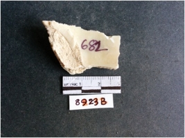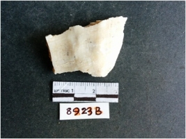 | Description / विवरण | The shell fragment is a small piece, with truncated ends and sharp edges. The piece has natural polish on its inner surface and outer surface has natural rough striations. The piece is pale white in color. The piece is waste material bi - product as a result of shell working at the site. |