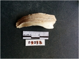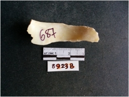 | Description / विवरण | The shell fragment is a small piece, with truncated ends and sharp edges. The piece has natural polish on its inner surface and outer surface has natural rough striations. The piece is pale white in color. The piece is waste material bi - product as a result of shell working at the site. |