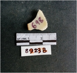 | Description / विवरण | The shell fragment is a small piece, with truncated ends and sharp edges. The piece has natural polish on its inner surface and outer surface has natural rough striations. The piece is pale white in color. The piece is waste material bi - product as a result of shell working at the site. |