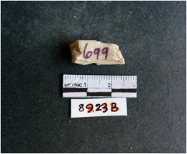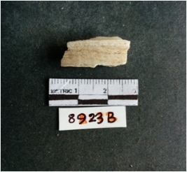 | Description / विवरण | The shell fragment is a small piece, with truncated ends and sharp edges. The piece has natural polish on its inner surface and outer surface has natural rough striations. The piece is pale white in color. The piece is waste material bi - product as a result of shell working at the site. |