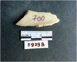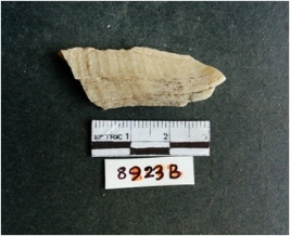 | Description / विवरण | The shell fragment is a small piece, with truncated ends and sharp edges. The piece has natural polish on its inner surface and outer surface has natural rough striations. The piece is pale white in color. The piece is waste material bi - product as a result of shell working at the site. |