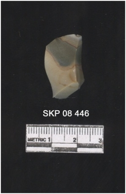 | Description / विवरण | Lithic debitage of chert, the sides are sharp and the ridges can be clearly seen. It has got a striking platform. The bulb of percussion can be seen on the ventral surface. |