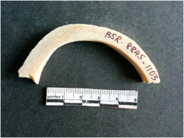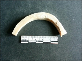 | Description / विवरण | This is a fragment of an unfinished shell circlet. It is an unfinished bangle fragment. It is white in color with polished inner surface and grounded outer surface. Rectangular in cross section. |