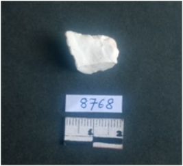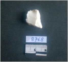 | Description / विवरण | This is a milky white quartz flake. There is a retouched marks on the bulb of percussion seen on striking platform. Sharp cut ridges on seen on the side. |