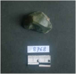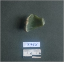 | Description / विवरण | This is a jasper stone fragment has a negative bulb of percussion, and a truncated end. The piece has ridges owing to flaking. The fragment is green in color. |