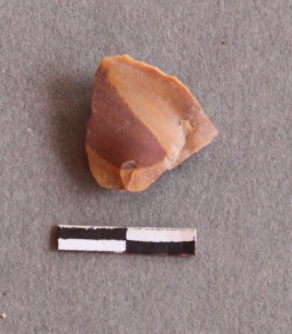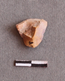 | Description / विवरण | The chert flake has a prominent bulb of percussion and sharp pointed edges. The dorsal surface has many flake scars. |
