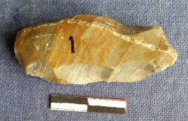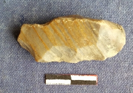 | Description / विवरण | This is a fragment of banded agate. Retouched and flakes removed. There in bulb of percussion seen with prominent striking paltform. |