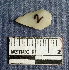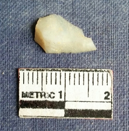 | Description / विवरण | A small fragment of milky quartz triangular in shape with a sharp pointed end on one end. Bulb of percussion seen on the broader side, resembles a small blade. |