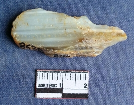 | Description / विवरण | This is a fragment of banded agate with one portion covered with cortex, one end is tappered to a point. Flakes removed from the suface, retouched edges. |