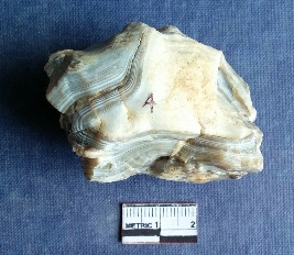 | Description / विवरण | This is a primary nodule of banded agate with beautiful bands arounf a crystaline white core, cortex covered in many areas of the surface. There are surfacial deposite of calcium and iron impurities on the cortex. |