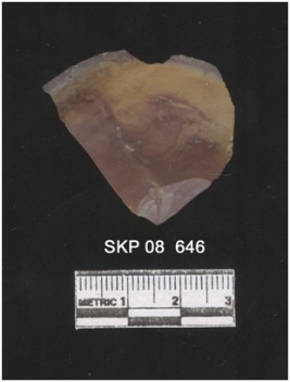 | Description / विवरण | It s a lithic debitage of chert. Cortex on one end. Positive bulb on ventral side. The dorsal surfaces show the flow of percussion. |