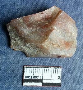 | Description / विवरण | This is a mossy quartz, crystaline rosy pink in color and transhicent, a small fragment of cortex seen, flaked ridges with ripples seen on the surface. |