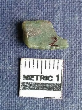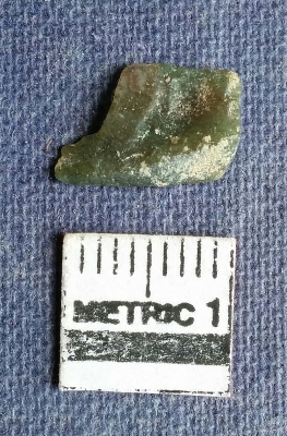 | Description / विवरण | This is a small fragment of mossy agate, transluscent green in color. |