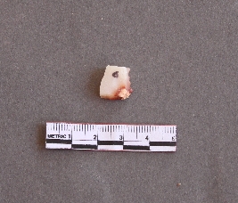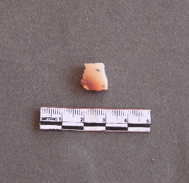 | Description / विवरण | A small flake of carnelian with cortex only one corner with calcium deposition and iron impurities. |