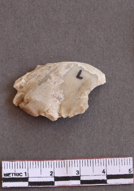 | Description / विवरण | Chert stone flake with calcium patination. |