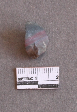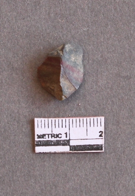 | Description / विवरण | The jasper flake has a prominent median ridge on account of flaking and a positive bulb of percussion on the ventral surface. The piece is dark in colour, with tapering sides and sharp edges. |