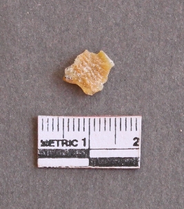 | Description / विवरण | The chalcedony flake has irregular sides and sharp ends as a result of flaking. |