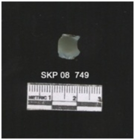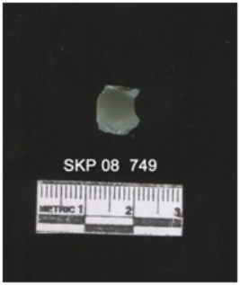 | Description / विवरण | The chert fragment is small with a clear bulb of percussion. The color is green with cupric impurities. |