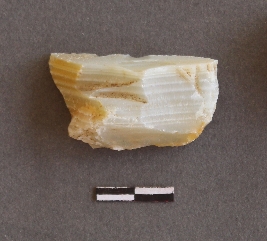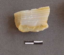 | Description / विवरण | The agate fragment is banded variety, with pointed edges and flake scars. The color is pale yellow. |