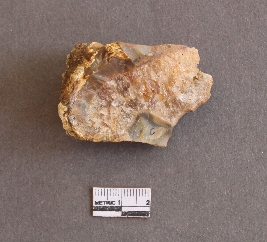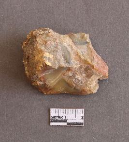 | Description / विवरण | Chalcedony nodule with flake scars and sharp ridges as a result of flaking. |