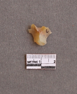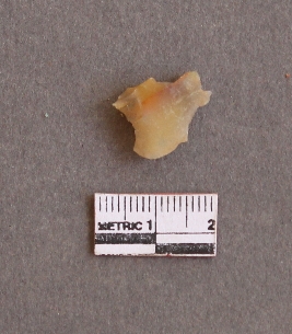 | Description / विवरण | It is chalcedony fragment. It has three flakes removed from its sides forming a median ridge. |