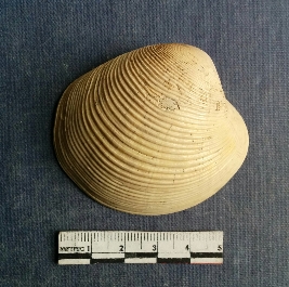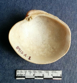 | Description / विवरण | The shell piece is pale white in color. It has surface striations on account of its natural formation. The piece has cut edges with angular points and some surface aberration. The piece is a by product of shell object making process. |