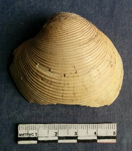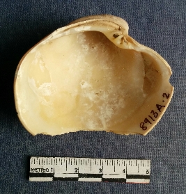| Description / विवरण | The shell piece is pale white in color. It has surface striations on account of its natural formation. The piece has cut edges with angular points and some surface aberration. The piece is a by product of shell object making process. |