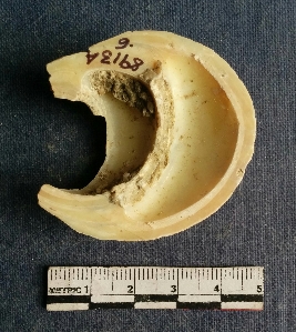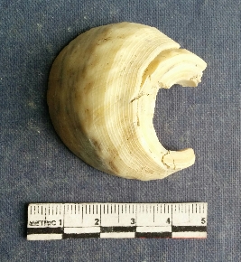 | Description / विवरण | The shell piece is pale white in color. It has surface striations on account of its natural formation. The piece has cut edges with angular points and some surface aberration. The piece is a by product of shell object making process. |