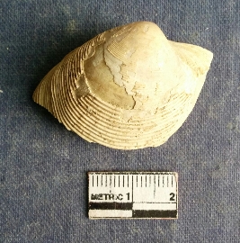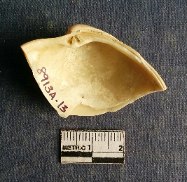 | Description / विवरण | The shell piece is pale white in color. It has surface striations on account of its natural formation. The piece has cut edges with angular points and some surface aberration. The piece is a by product of shell object making process. |