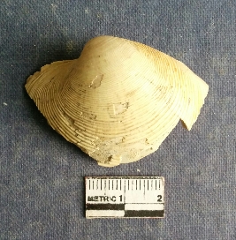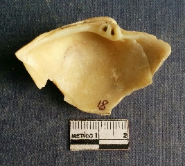| Description / विवरण | The shell piece is pale white in color. It has surface striations on account of its natural formation. The piece has cut edges with angular points and some surface aberration. The piece is a by product of shell object making process. |