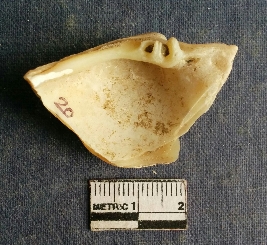 | Description / विवरण | The shell piece is pale white in color. It has surface striations on account of its natural formation. The piece has cut edges with angular points and some surface aberration. The piece is a by product of shell object making process. |