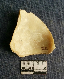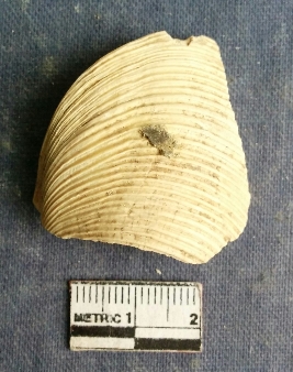| Description / विवरण | The shell piece is pale white in color. It has surface striations on account of its natural formation. The piece has cut edges with angular points and some surface aberration. The piece is a by product of shell object making process. |