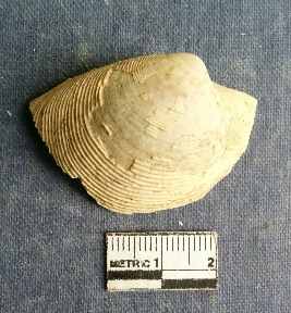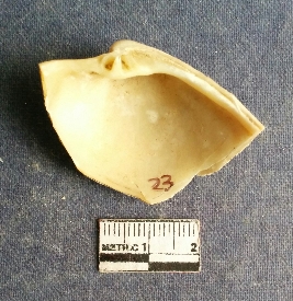 | Description / विवरण | The shell piece is pale white in color. It has surface striations on account of its natural formation. The piece has cut edges with angular points and some surface aberration. The piece is a by product of shell object making process. |