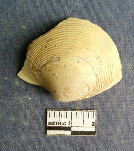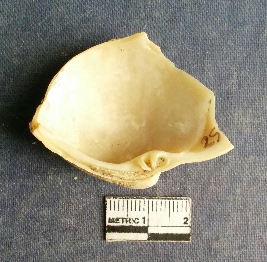 | Description / विवरण | The shell piece is pale white in color. It has surface striations on account of its natural formation. The piece has cut edges with angular points and some surface aberration. The piece is a by product of shell object making process. |