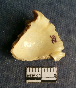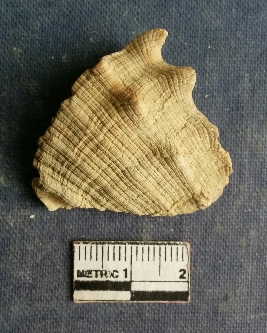 | Description / विवरण | The shell piece is pale white in color. It has surface striations on account of its natural formation. The piece has cut edges with angular points and some surface aberration. The piece is a by product of shell object making process. |