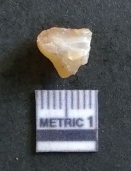 | Description / विवरण | The chalcedony flake is small, with pale coloration and crypto-crystalline matrix. The piece shows prominent flake scars and sharp edges owing to lithic knapping activity. |