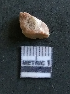| Description / विवरण | The quartz flake is small, with pale coloration and crypto-crystalline matrix. The piece shows prominent flake scars and sharp edges owing to lithic knapping activity. |