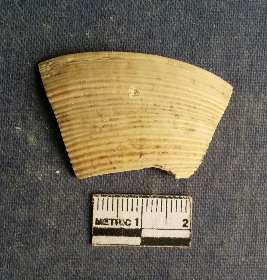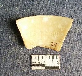 | Description / विवरण | The shell piece is pale white in color. It has surface striations on account of its natural formation. The piece has cut edges with angular points and some surface aberration. The piece is a by product of shell object making process. |