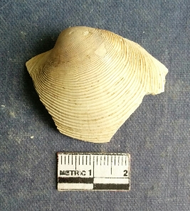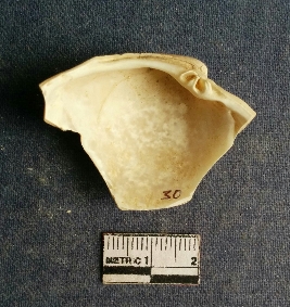 | Description / विवरण | The shell piece is pale white in color. It has surface striations on account of its natural formation. The piece has cut edges with angular points and some surface aberration. The piece is a by product of shell object making process. |