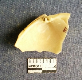 | Description / विवरण | The shell piece is pale white in color. It has surface striations on account of its natural formation. The piece has cut edges with angular points and some surface aberration. The piece is a by product of shell object making process. |