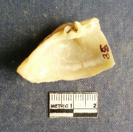 | Description / विवरण | The shell piece is pale white in color. It has surface striations on account of its natural formation. The piece has cut edges with angular points and some surface aberration. The piece is a by product of shell object making process. |