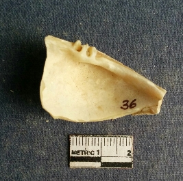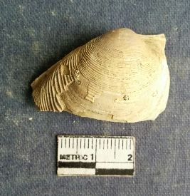 | Description / विवरण | The shell piece is pale white in color. It has surface striations on account of its natural formation. The piece has cut edges with angular points and some surface aberration. The piece is a by product of shell object making process. |