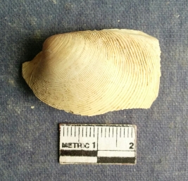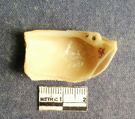 | Description / विवरण | The shell piece is pale white in color. It has surface striations on account of its natural formation. The piece has cut edges with angular points and some surface aberration. The piece is a by product of shell object making process. |