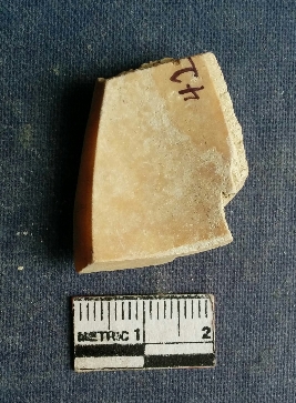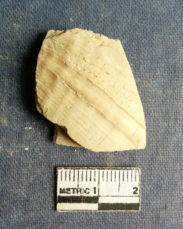 | Description / विवरण | The shell piece is pale white in color. It has surface striations on account of its natural formation. The piece has cut edges with angular points and some surface aberration. The piece is a by product of shell object making process. |